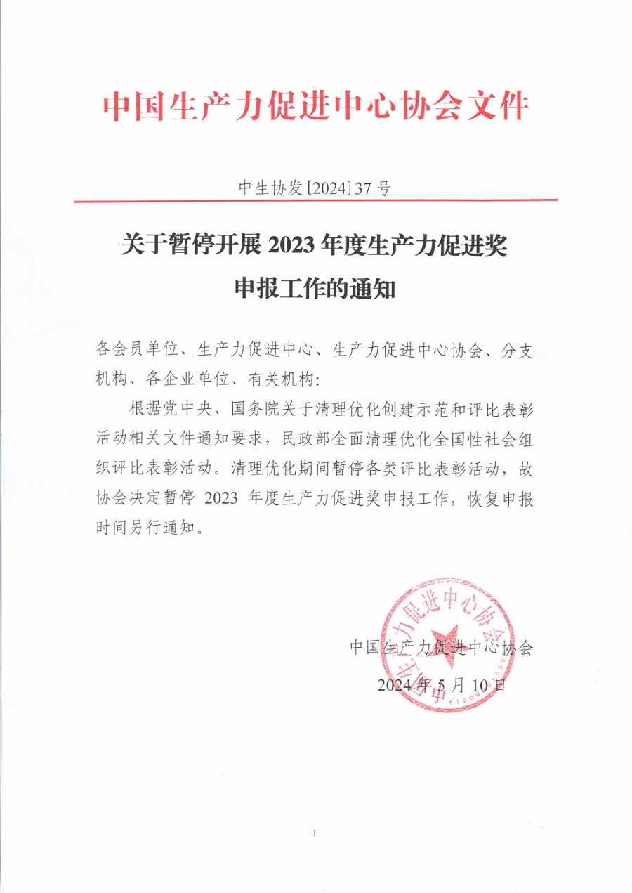 关于暂停开展2023年度生产力促进奖申报工作的通知